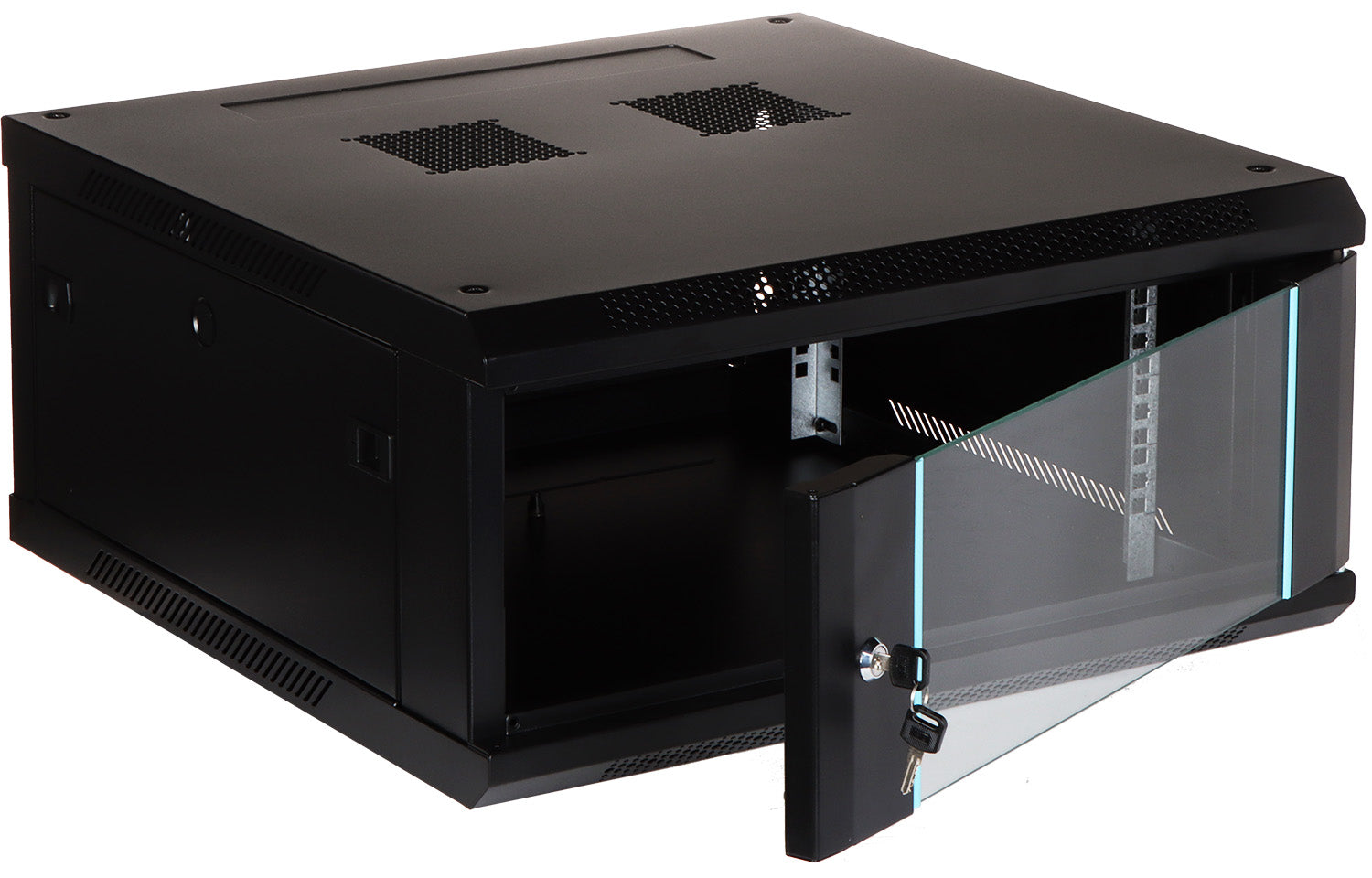 Deze RA19-4U-600 patchkast is een ultra-compacte 19 inch serverkast, ideaal voor kleine netwerkopstellingen, telecomapparatuur, modems, switches en patchpanelen. Met 4U hoogte en een binnendiepte van 545 mm biedt deze kast verrassend veel functionaliteit in een zeer klein formaat. De kast heeft een nette en professionele afwerking in zwart RAL9004, gecombineerd met een glazen voordeur en inklikbare metalen zijwanden voor directe en gemakkelijke toegang.