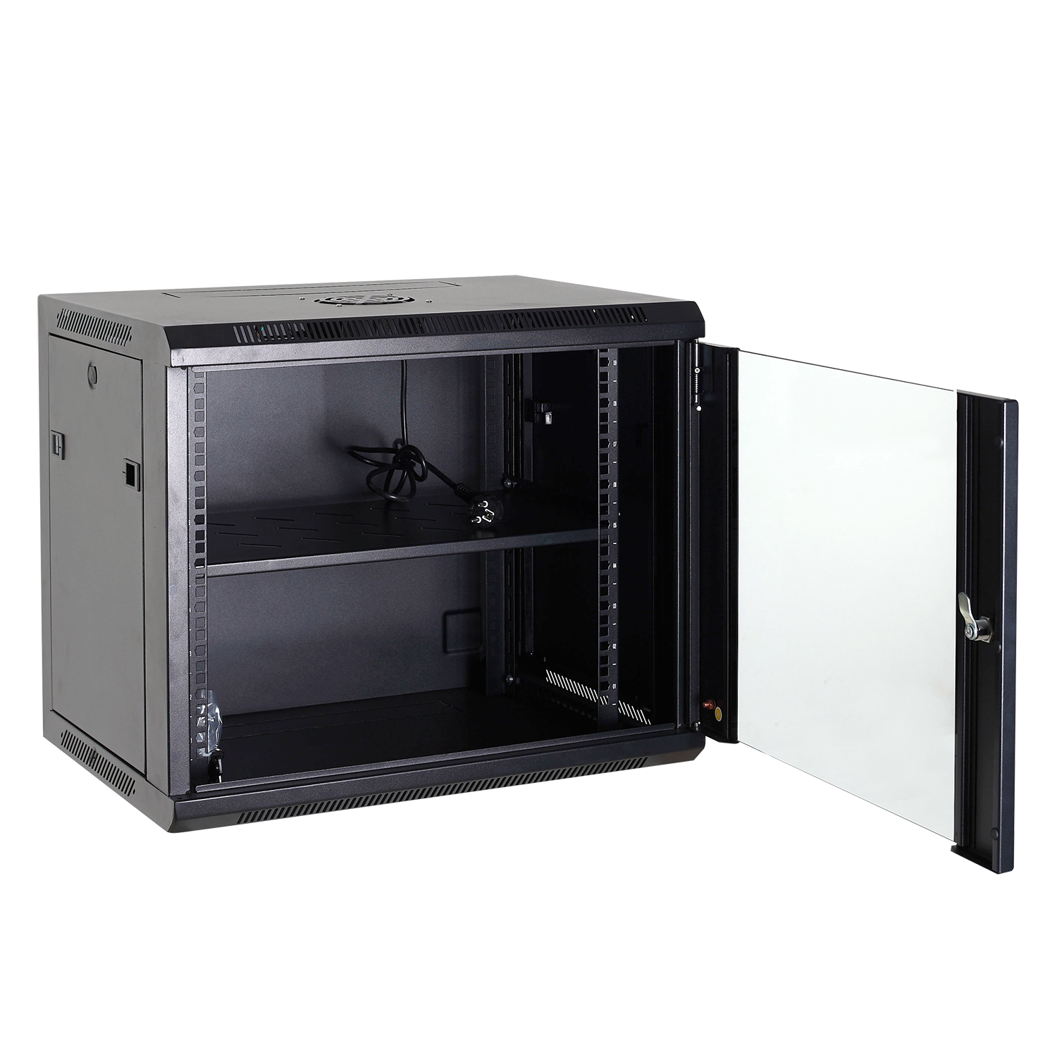 Gemaakt van dik gepoedercoat plaatstaal (SPCC) en voorzien van een gehard glazen deur met slot en twee sleutels, biedt deze kast zowel veiligheid als gemak. De deur kan tot 180 graden worden geopend voor eenvoudige toegang. Daarnaast zijn de zijpanelen verwijderbaar en kunnen ze worden beveiligd met sloten (niet meegeleverd).
